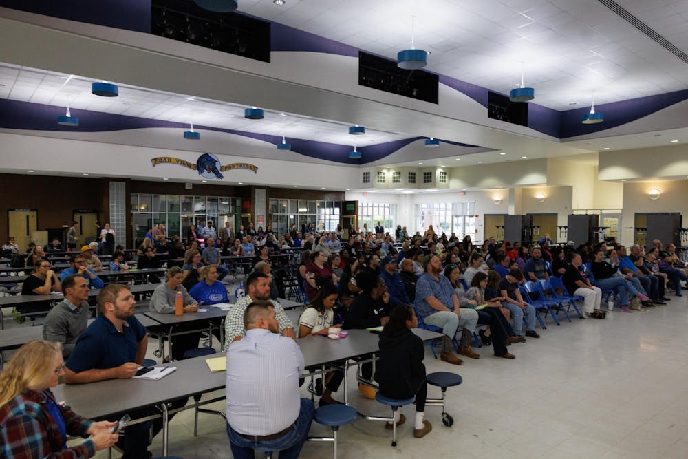 Community members listen during a meeting at Oak View Middle School reguarding the school's transition to a K-8 school, Tuesday, April 7, 2026.