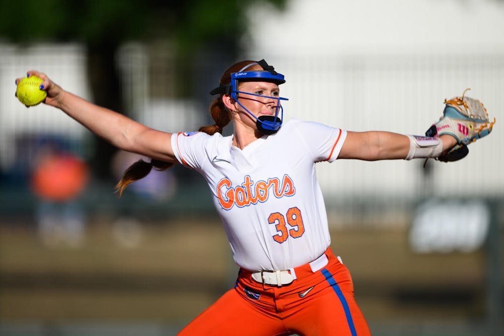 Florida right-handed pitcher Katelynn Oxley (39) throws during an NCAA softball game against FGCU, Wednesday, April 15, 2026, in Gainesville, Fla.
