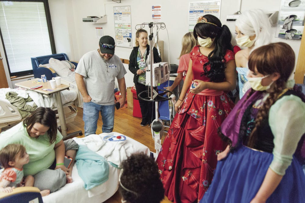 A group of princesses make a visit to a patient at UF Health Shands Hospital. The princesses visit the hospital once a month.