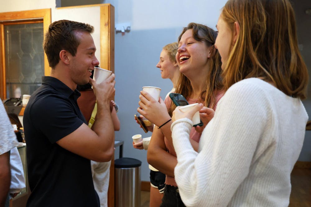 John McKeehan (left), Caroline Morris (center) and Lucia Claire (right) laugh while they try samples of potential fall drinks at Pascal's Coffeehouse's the semesterly barista competition on Tuesday, Sept. 16, 2025.