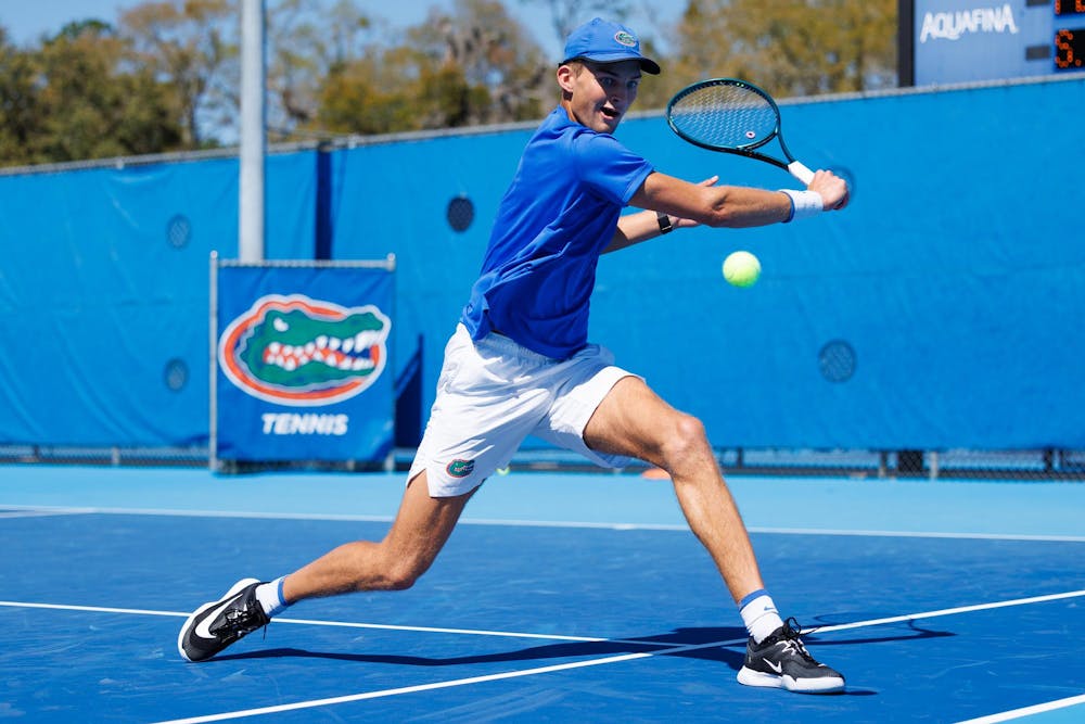 Florida Gators tennis player Henry Jefferson prepares to hit the ball during an NCAA tennis match against South Carolina, Sunday, March. 1, 2026, in Gainesville, Fla.