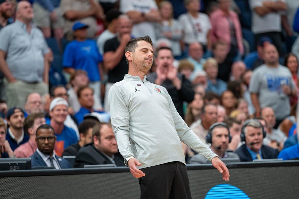 Florida head coach Todd Golden reacts to a call made by the referees during the first half of an NCAA Tournament second round game against Iowa, Sunday, March 22, 2026, in Tampa, Fla.