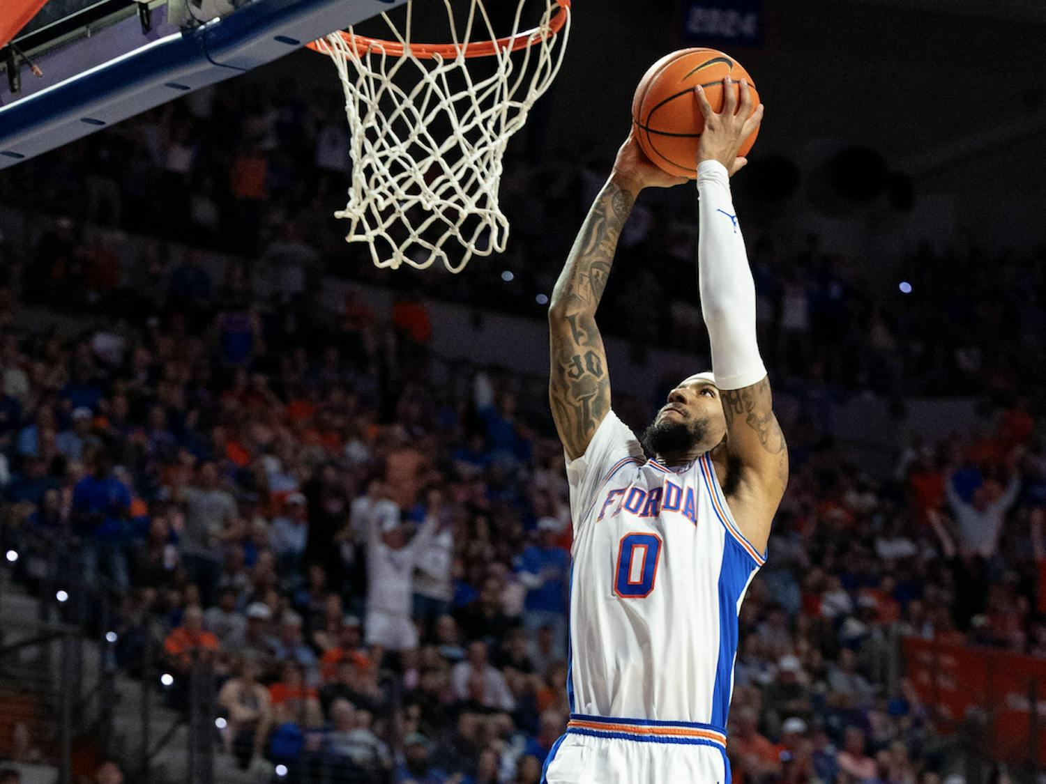 Florida guard Boogie Fland (0) dunks during the first half of an NCAA college basketball game against Kentucky, Saturday, Feb. 14, 2026 at Exactech Arena in Gainesville, Fla.