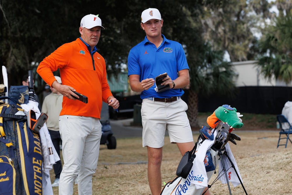 Florida Men’s Golf head coach J.C. Deacon talks with Florida’s Noah Kent during the Gators Invitational, an NCAA golf tournament, at the Mark Bostick Golf Course, Sunday, Feb. 15, 2026, in Gainesville, Fla.
