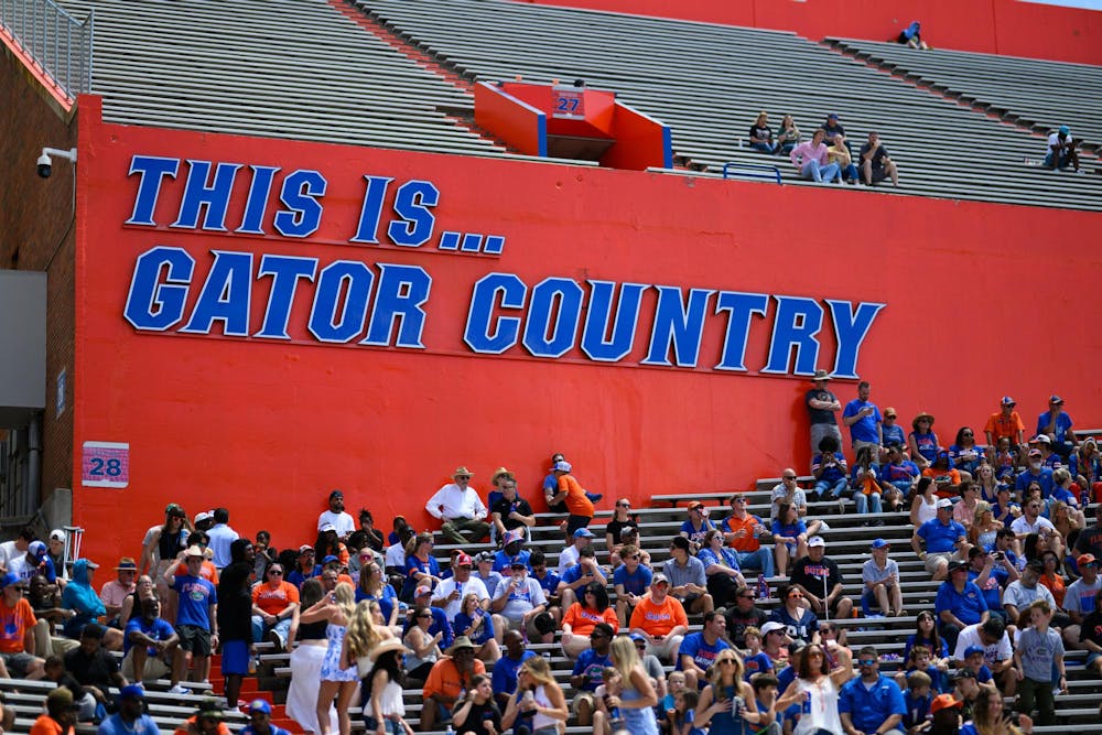 A sign reads “This is… Gator Country” inside Ben Hill Griffin Stadium.