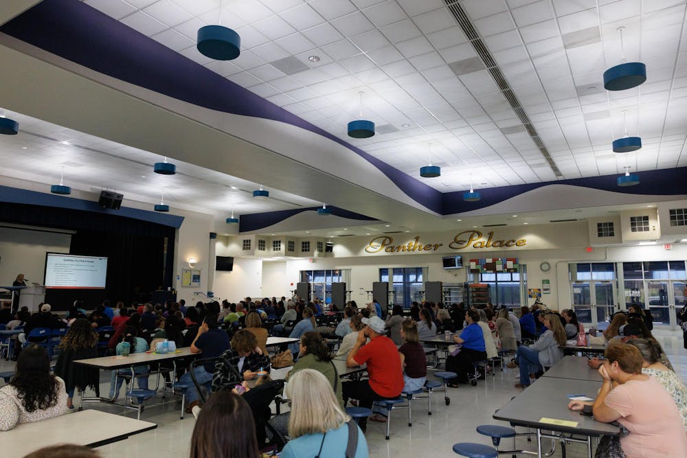 By Ryan Friedenberg | 8:57amAlachua County Public Schools Deputy Superintendent Cathy Atria speaks during at meeting at Oak View Middle School, Tuesday, April 7, 2026.