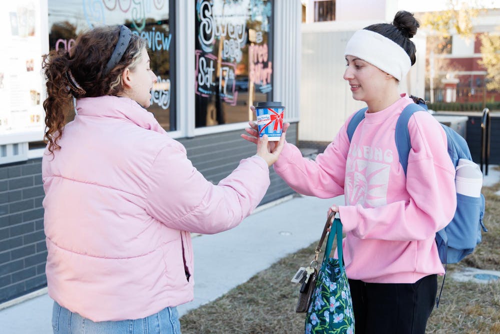 7 Brew Coffee employee Ali Barrett hands Kristen Adams her drink at their new Gainesville location, Friday, Jan. 16, 2026.