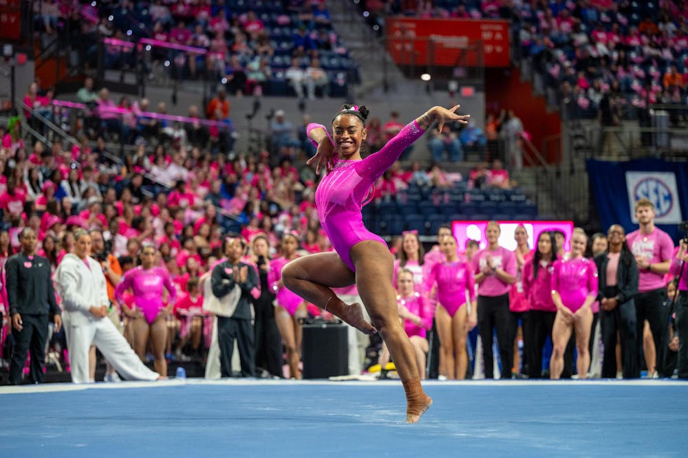 Florida gymnast Selena Harris-Miranda performs on the floor during an NCAA gymnastics meet against Oklahoma, Friday, Feb. 13, 2026, in Gainesville, Fla.