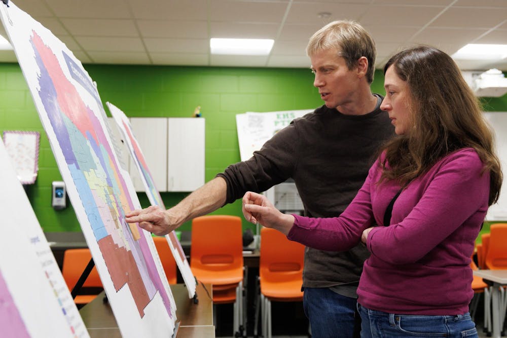 Raymond Rawls and Lorraine Duerden look at an elementary school rezoning map proposal at a community rezoning meeting held at Eastside High School in Gainesville, Fla., Wednesday, Feb. 11, 2026.