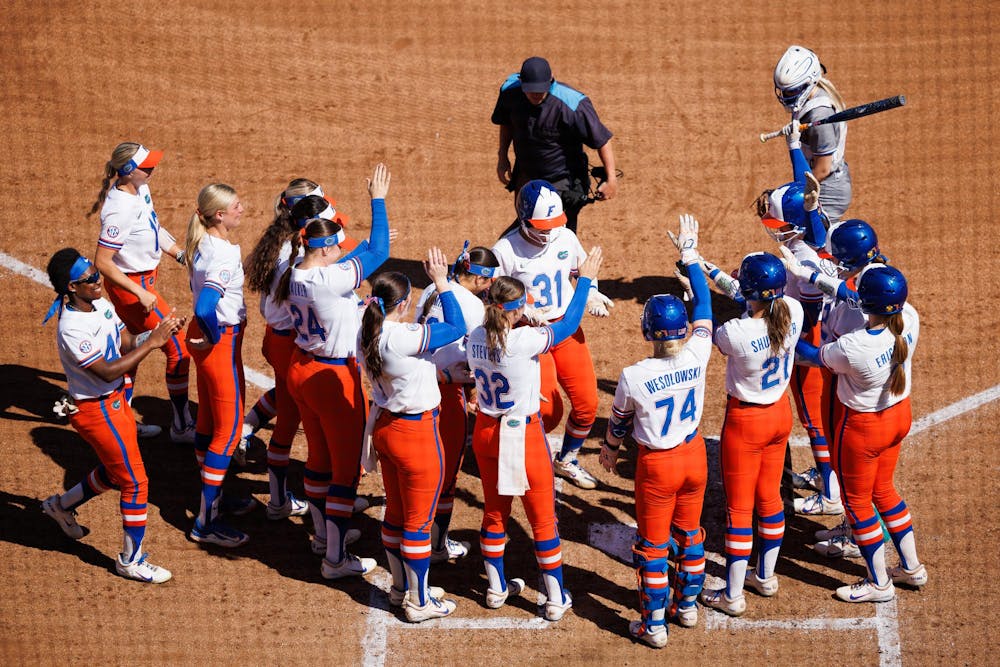 The Florida Gators softball team greets Florida Gators infielder Kenleigh Cahalan at home plate after a home run during an NCAA softball game against MTSU, Sunday, Feb. 22, 2026, in Gainesville, Fla.