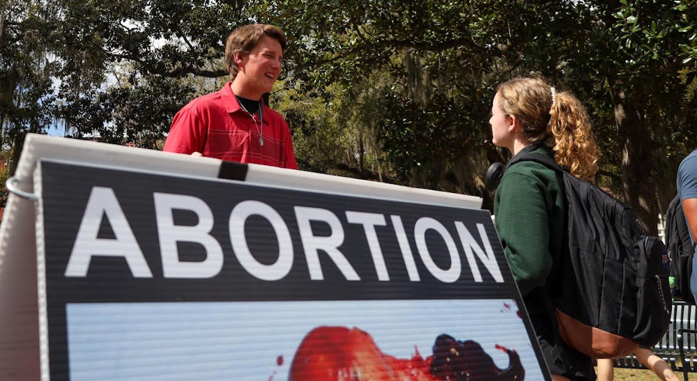 Madoc, a high-schooler from Columbus, OH, shares pamphlets about abortion to UF students on Plaza of the Americas, March 6, 2026 in Gainesville, Fla.