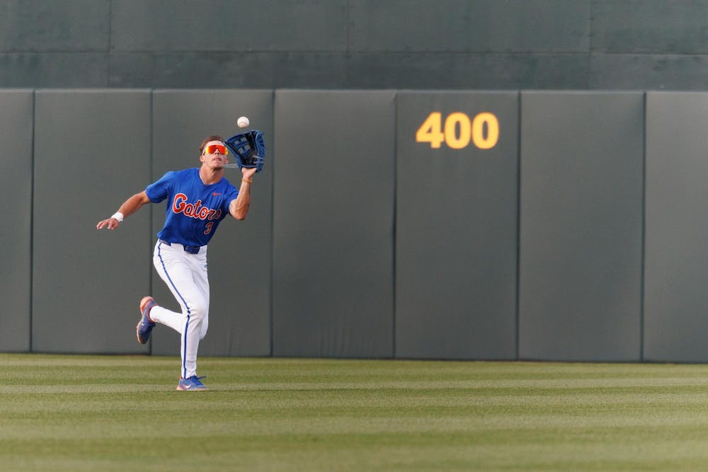 Florida outfielder Kyle Jones (3) catches the ball for an out during an NCAA baseball game against Jacksonville University, Tuesday, March 31, 2026, in Gainesville, Fla.