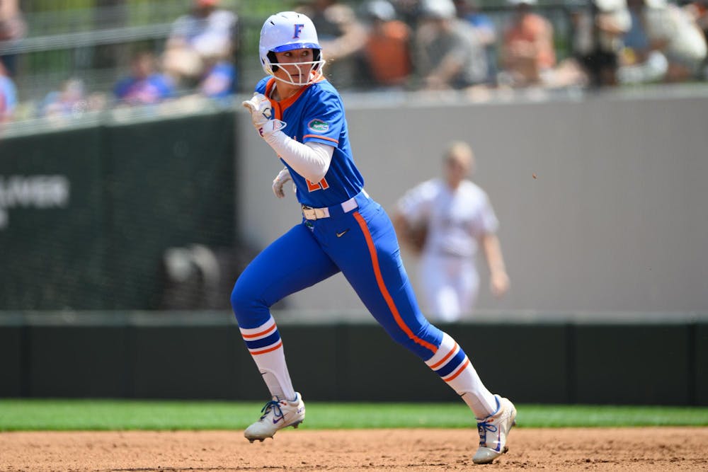 Florida outfielder Taylor Shumaker (21) runs to second base during an NCAA softball game against Mississippi State, Saturday, April 4, 2026, in Gainesville, Fla.