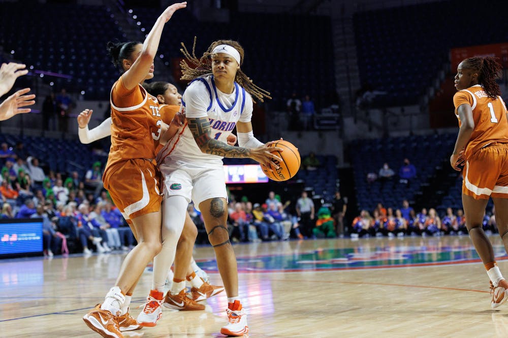 Florida forward Jade Weathersby (1) dribbles during the second quarter/half of an NCAA basketball game against Texas, Thursday, Jan. 29, 2026, in Gainesville, Fla.