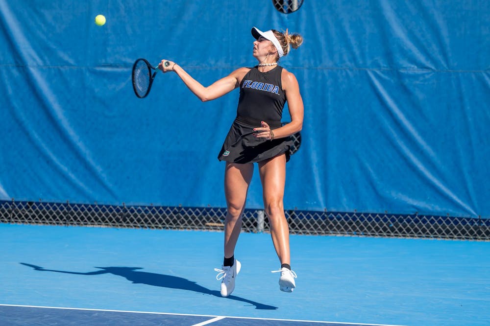Florida’s Lucie Pawlak hits the ball during an NCAA women’s tennis match against Troy, Friday, Feb. 13, 2026, in Gainesville, Fla.