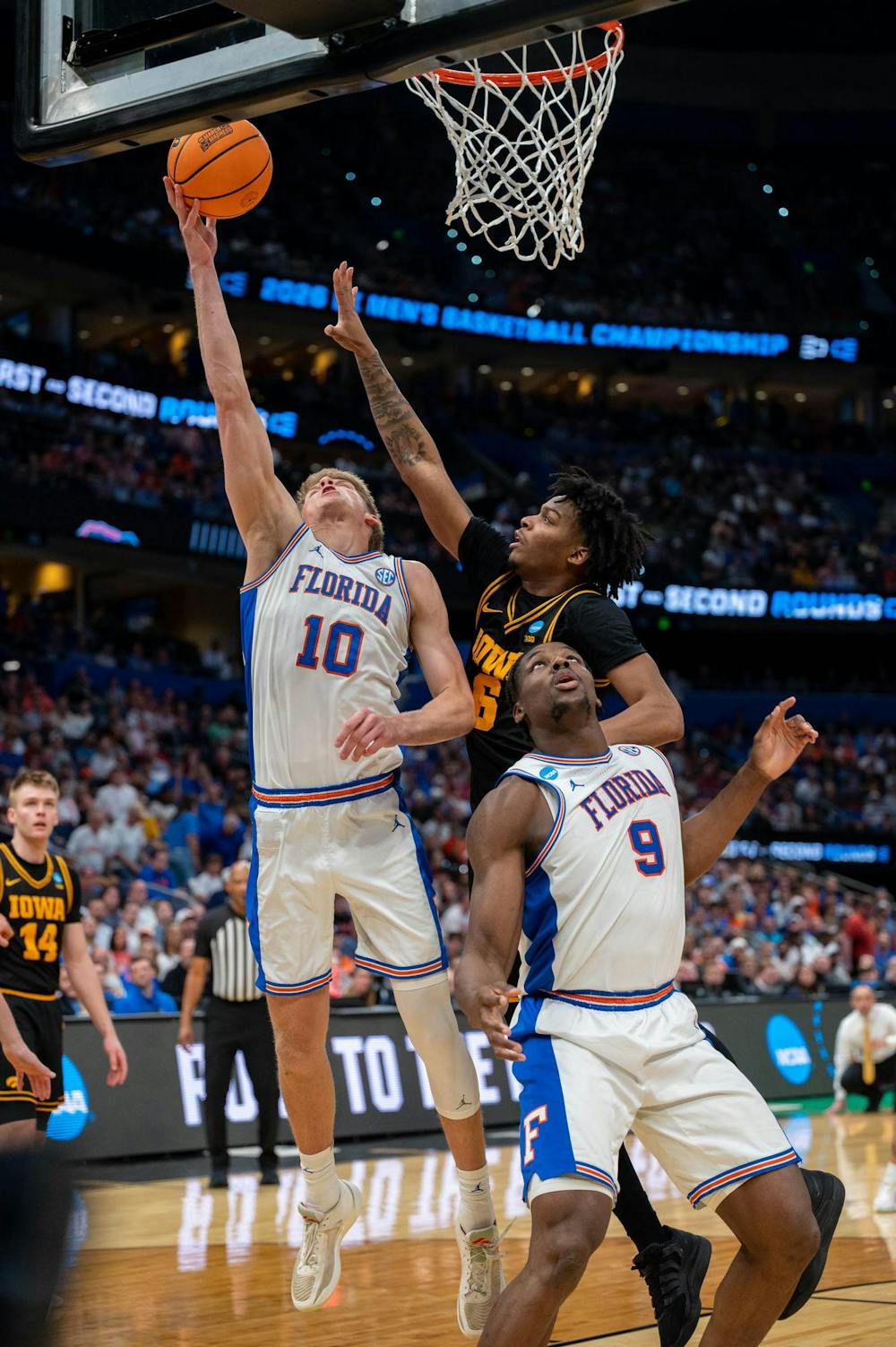 Florida forward Thomas Haugh (10) goes for a layup during the second half of an NCAA Tournament second round game against Iowa, Saturday, March 22, 2026, in Tampa, Fla.