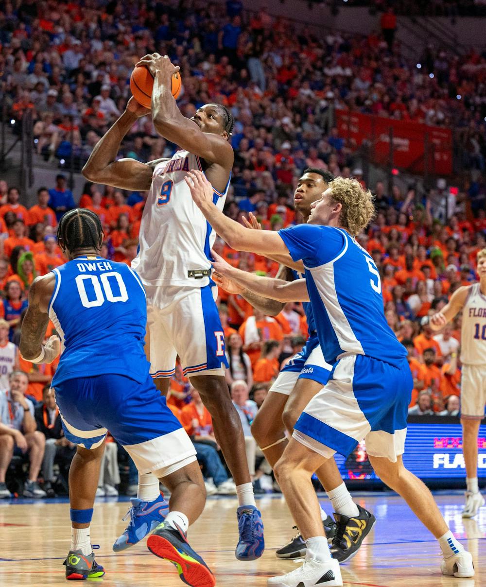 Florida center Rueben Chinyelu (9) lays the ball up against Kentucky guard Otega Oweh (00) and guard Collin Chandler (5) during the first half of an NCAA college basketball game, Saturday, Feb. 14, 2026 at Exactech Arena in Gainesville, Fla.