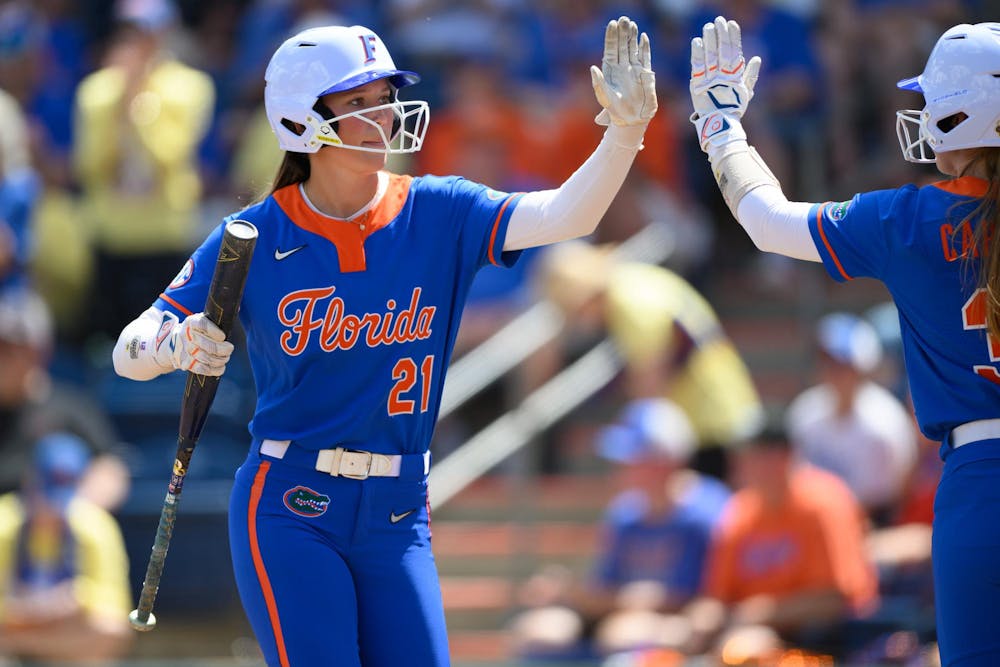 Florida outfielder Taylor Shumaker (21) high fives infielder Kenleigh Cahalan (31) during an NCAA softball game against Mississippi State, Saturday, April 4, 2026, in Gainesville, Fla.