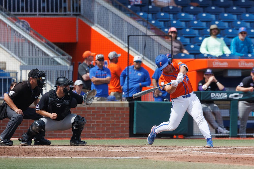 Florida catcher Karson Bowen (14) hits the ball during an NCAA baseball game against High Point University, Sunday, March 8, 2026, in Gainesville, Fla.