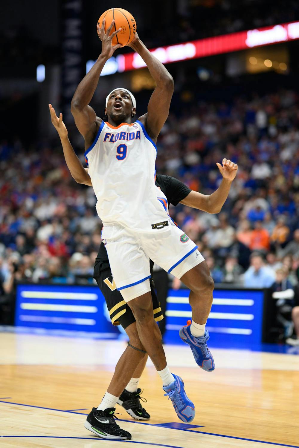 Florida center Rueben Chinyelu (9) shoots a layup during the first half of an SEC Men's Basketball Tournament semifinal game against Vanderbilt, Saturday, March 14, 2026, in Nashville, Tenn.