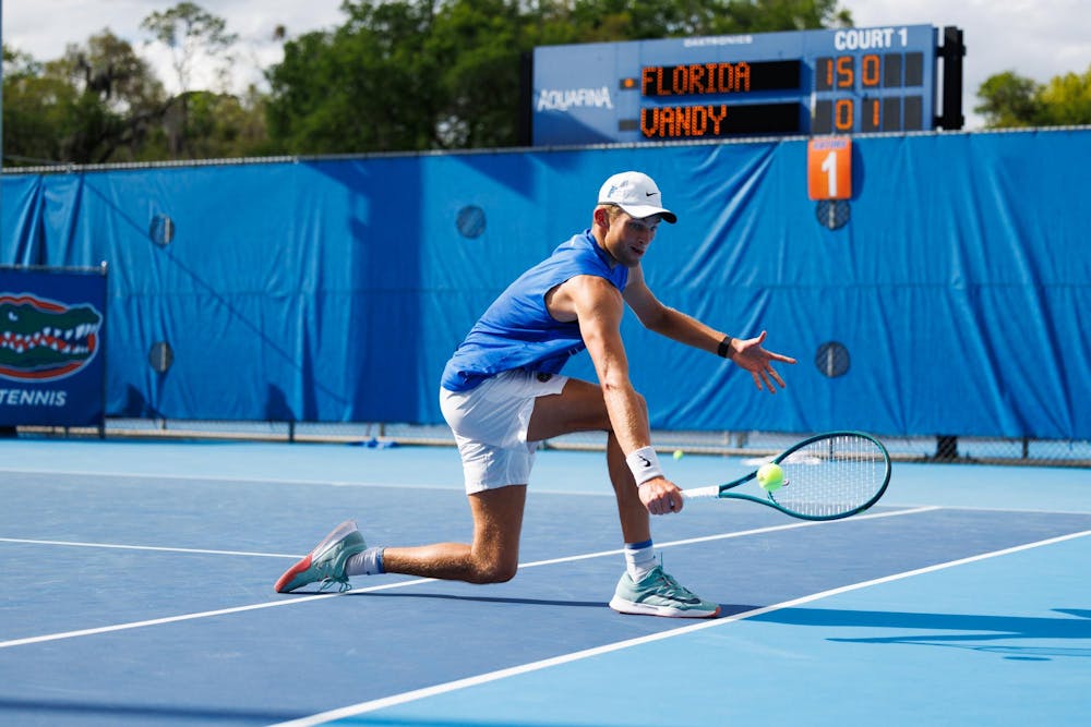 during an NCAA tennis match against Vanderbilt, Thursday, April 2, 2026, in Gainesville, Fla.