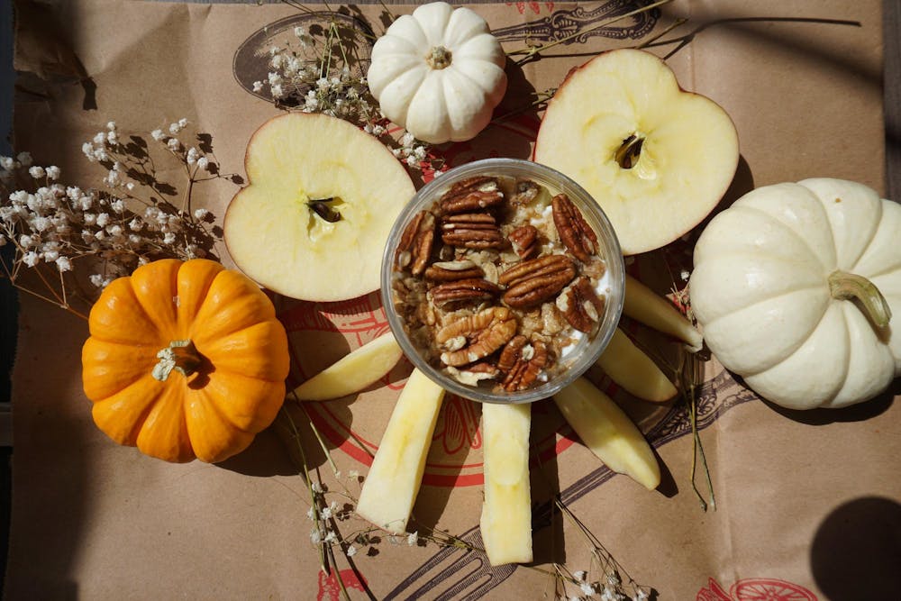 A spiced apple Crisp yogurt parfait pairs with an optional drizzle of maple syrup.