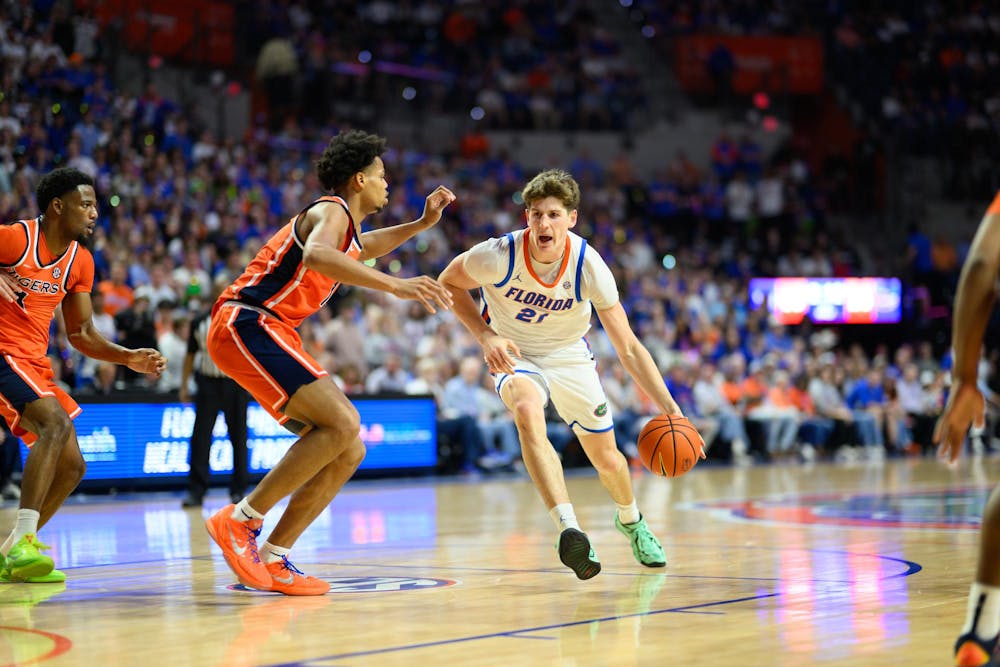 Florida forward Alex Condon (21) drives during the first half of an NCAA college basketball game against Auburn, Saturday, Jan. 24, 2026, in Gainesville, Fla.