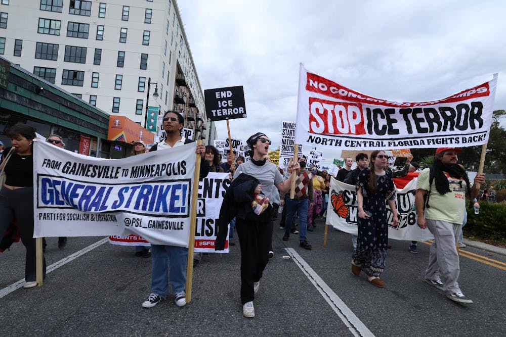 Protestors march down University Ave. during an anti-ICE protest in Gainesville, Fla., Friday, Jan. 30, 2026.