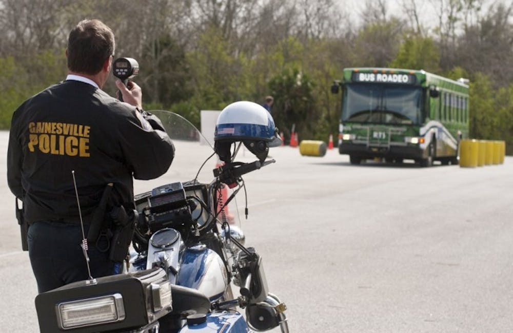 Officer Brian Fundenburg clocks bus's top speeds in the final stretch of the RTS Bus Roadeo on Saturday. Buses were expected to reach 20 mph.