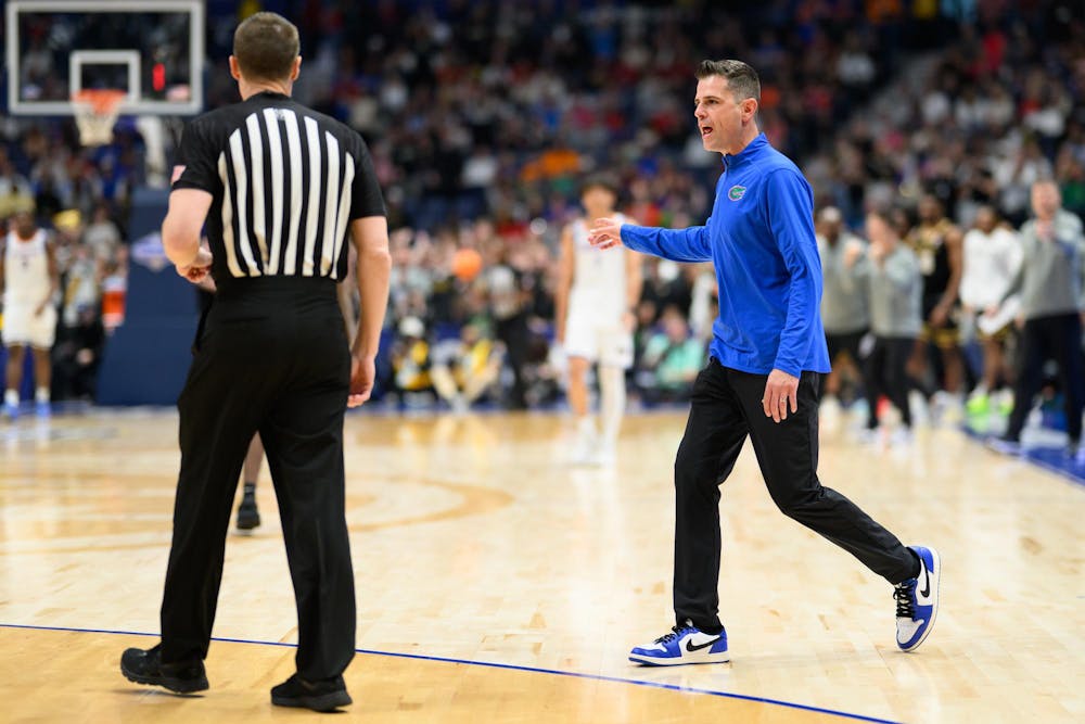 Florida head coach Todd Golden yells at a referee before getting a technical foul during the second half of an SEC Men's Basketball Tournament semifinal game against Vanderbilt, Saturday, March 14, 2026, in Nashville, Tenn.