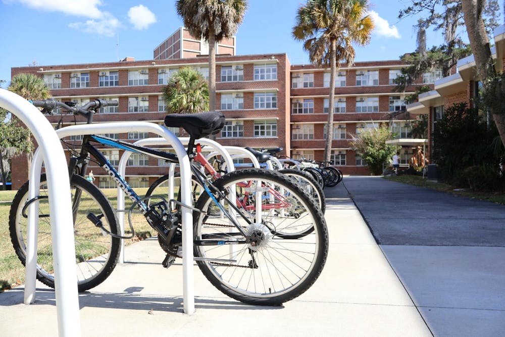 Bikes sit locked up in front of Broward Hall on UF campus, Saturday, Feb. 21, 2026. Records from the University of Florida Police Department detail bicycle and scooter theft reports across campus, highlighting patterns and potential theft hotspots.