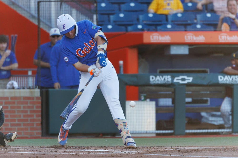 Florida infielder Ethan Surowiec (10) swings his bat during an NCAA baseball game against Bethune-Cookman University, Tuesday, April 14, 2026, in Gainesville, Fla.