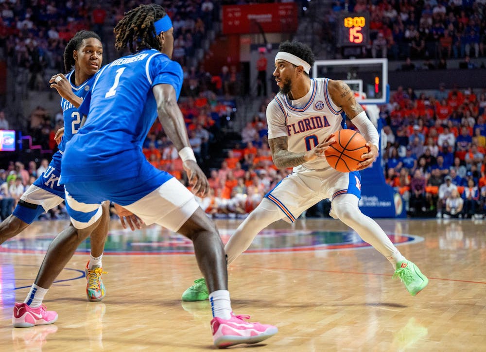 Florida guard Boogie Fland (0) dribbles against Kentucky guard Denzel Aberdeen (1) during the first half of an NCAA college basketball game, Saturday, Feb. 14, 2026 at Exactech Arena in Gainesville, Fla.
