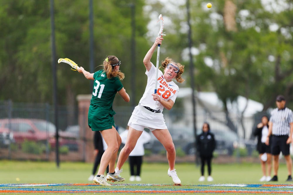 Florida defender Jenny Woodings (28) takes a draw during an NCAA Lacrosse game against South Florida, Wednesday, April 8, 2026, in Gainesville, Fla.