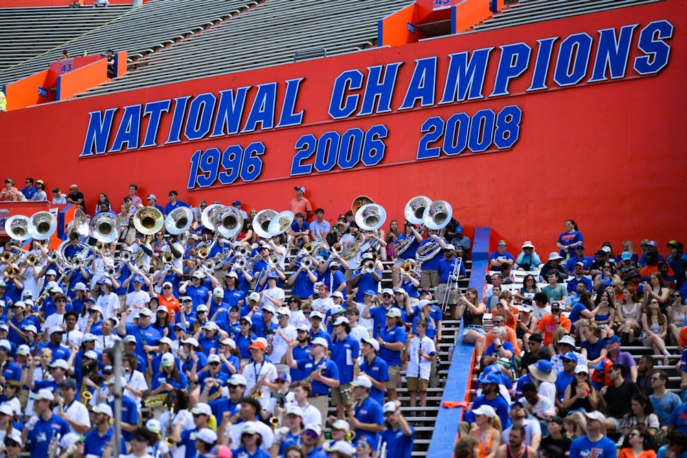 A sign displays the Gators past national championships inside Ben Hill Griffin Stadium.