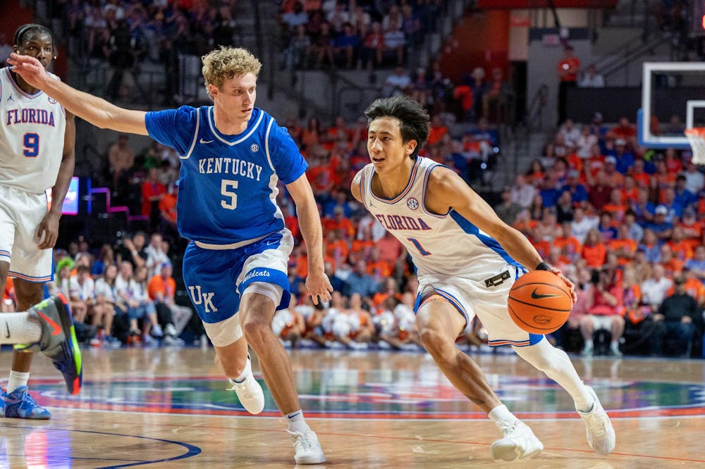 Florida guard Xaivian Lee (1) drives to the basket against Kentucky guard Collin Chandler (5) during the first half of an NCAA college basketball game, Saturday, Feb. 14, 2026 at Exactech Arena in Gainesville, Fla.