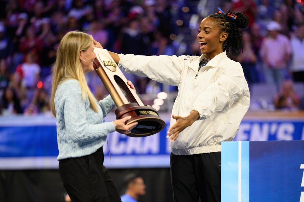 Florida gymnast Anya Pilgrim accepts the thrid place trophy after the NCAA gymnastics National Championship against Oklahoma, LSU and Minnesota, Saturday, April 18, 2026, in Fort Worth, Texas.