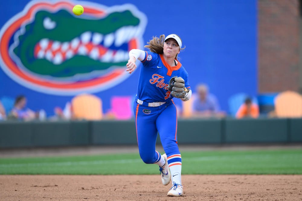 Florida infielder Kenleigh Cahalan (31) throws during an NCAA softball game against Mississippi State, Saturday, April 4, 2026, in Gainesville, Fla.