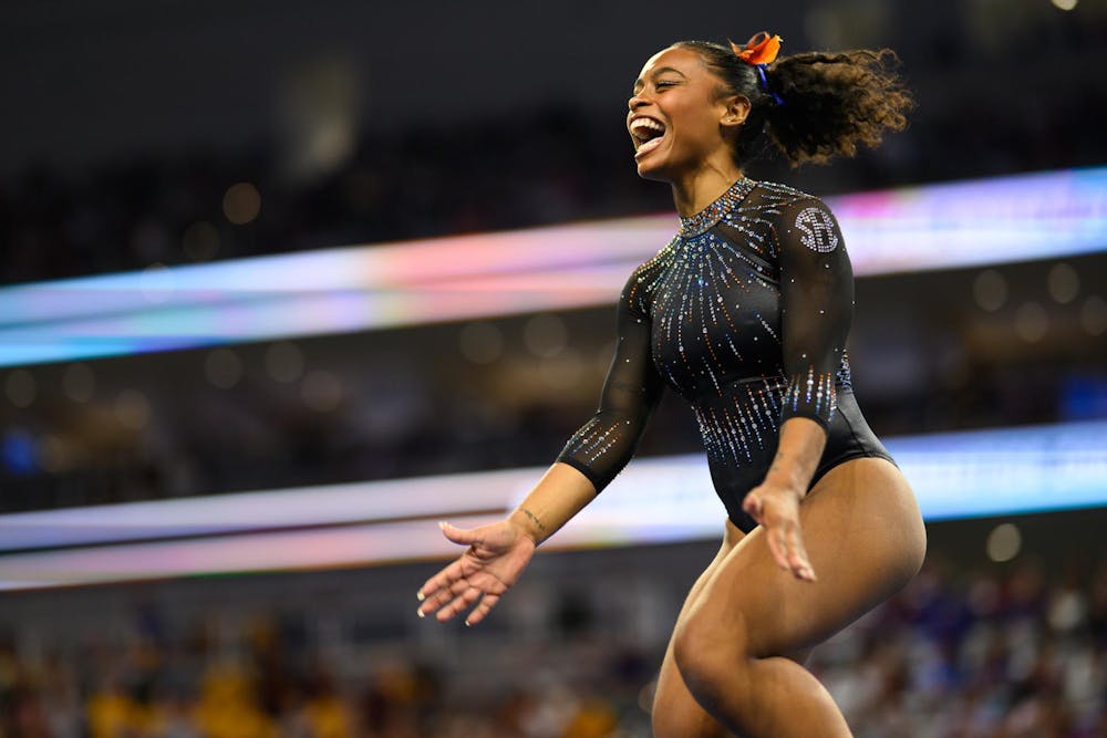 Florida gymnast Selena Harris-Miranda celebrates her performance on the floor during the NCAA gymnastics National Championship against Oklahoma, LSU and Minnesota, Saturday, April 18, 2026, in Fort Worth, Texas.