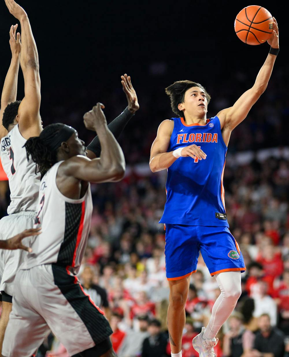 Florida guard Xaivian Lee (1) shoots a layup during the second half of an NCAA college basketball game against Georgia, Wednesday, Feb. 11, 2026, in Athens, Ga.