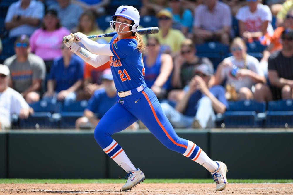Florida outfielder Taylor Shumaker (21) hits during an NCAA softball game against Mississippi State, Saturday, April 4, 2026, in Gainesville, Fla.