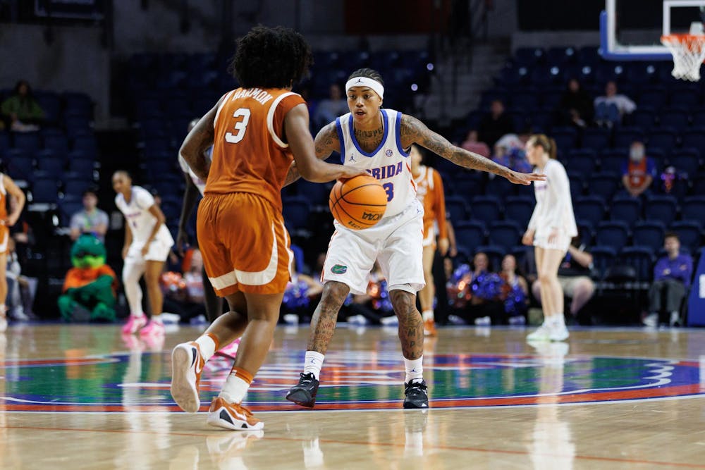 Florida guard Liv McGill (23) defends during the second half of an NCAA basketball game against Texas, Thursday, Jan. 29, 2026, in Gainesville, Fla.