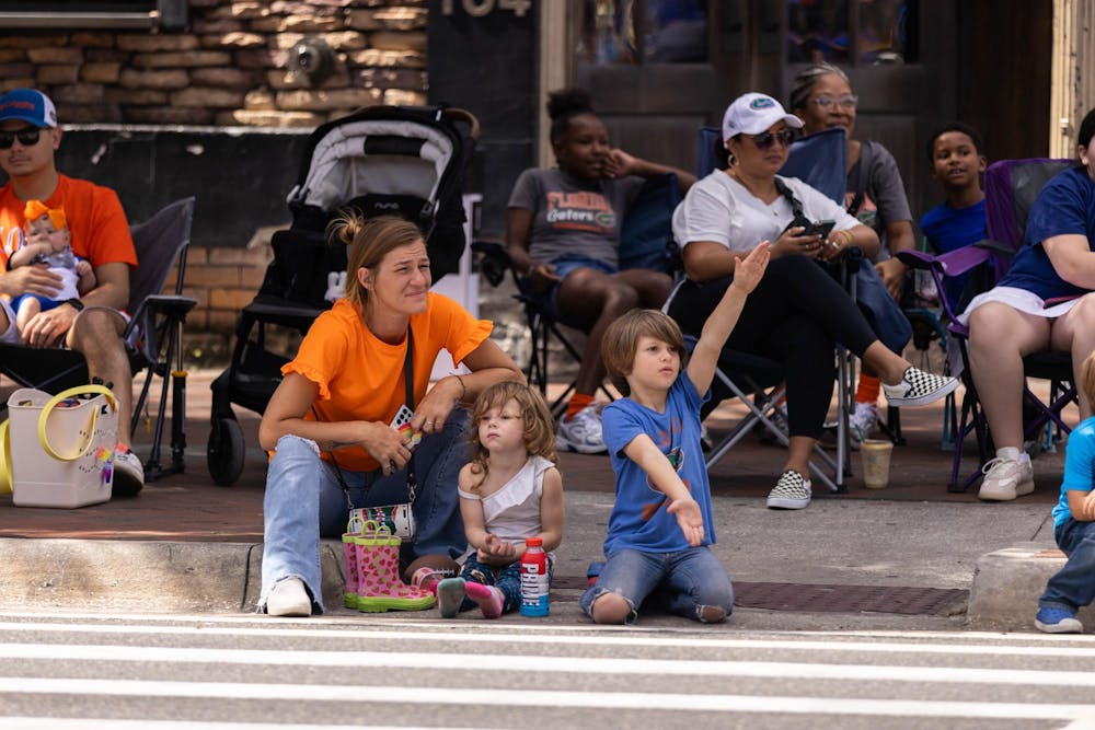 Parade floats travel across University Avenue during the Homecoming Parade in Gainesville on Friday, Oct. 17, 2025.