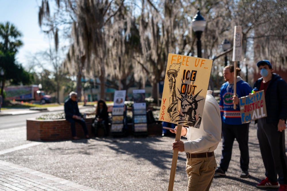 The Young Democratic Socialists of America gather with signs at Turlington Plaza in Gainesville, Fla. Friday, Jan 30, 2026.