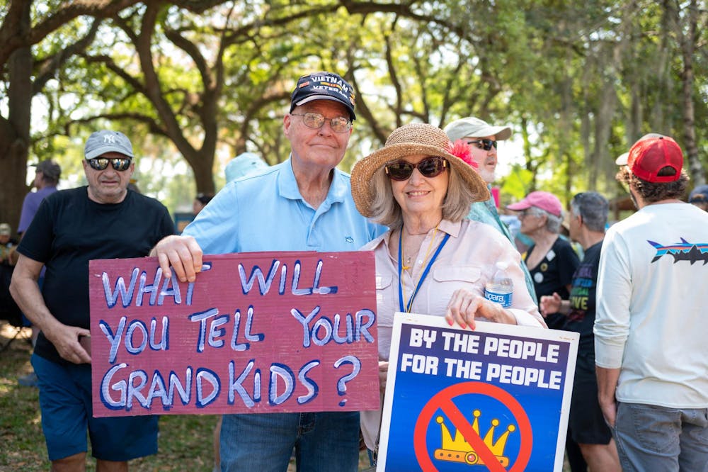 A Vietnam Veteran stands with a sign saying “What will you tell your grandkids?” at Cora Robertson Park, Saturday, March 28, 2026, in Gainesville, Fla.