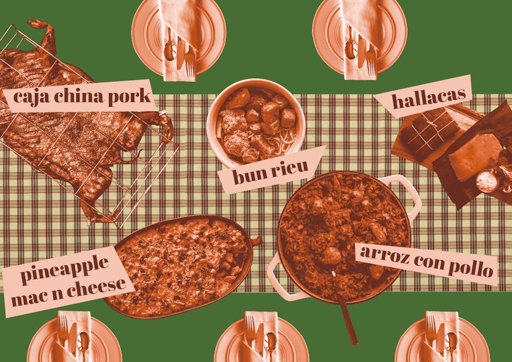 In addition to traditional American Thanksgiving foods, other cultural meals make an appearance for some families every year, such as Caja China Pork, Mac and Cheese with Pineapple, Hallacas, Arroz Con Pollo, and Bun Rieu.
