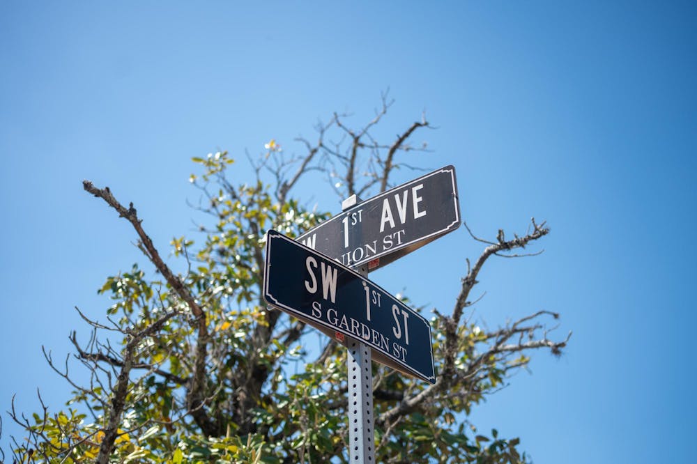 A street sign marks the intersection of SW 1st Street and SW 1st Avenue in Gainesville, Fla., Friday, April 17, 2026.