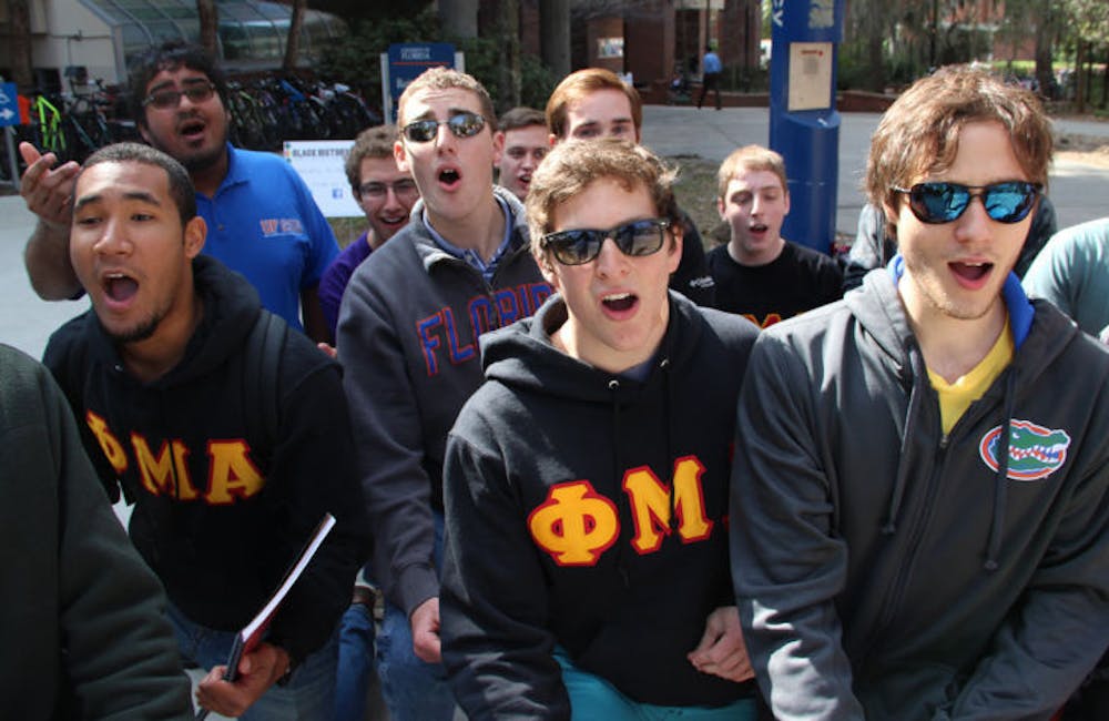Brothers of Phi Mu Alpha serenade students walking near the front of the Reitz Union on Thursday. The music fraternity is selling Valentine’s Day serenades to anyone in Gainesville as a fundraiser for Relay for Life and other organizations. For more information, visit ufphimualpha.com.