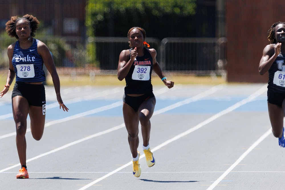 Malia Campbell competes in the women’s 200 meter during the Tom Jones Memorial Invitational in Gainesville, Fla., Friday, April 17, 2026.