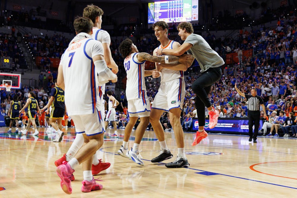Florida Gators center Olivier Rioux (32) celebrates with his teammates after scoring his first career point in a game against Merrimack, Friday, Nov. 21, 2025, in Gainesville, Fla.Gainesville, Fla.